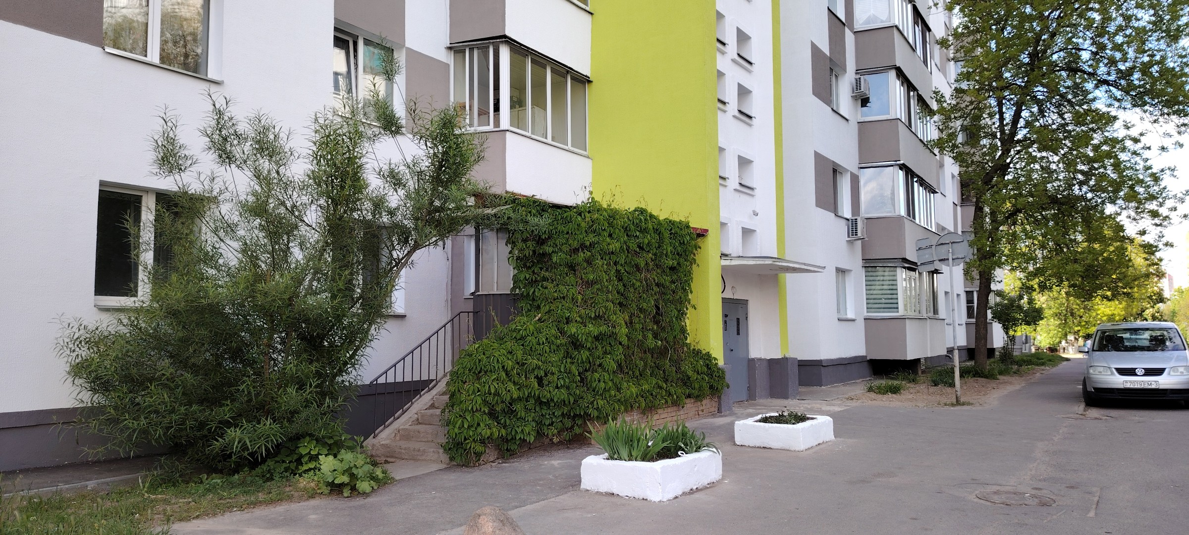 Перед домом парковка под видеонаблюдением.
